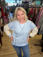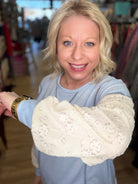 Who doesn’t love a little bit of lace! The lace sleeves on this pretty baby blue top make it so feminine yet it is comfy and casual!