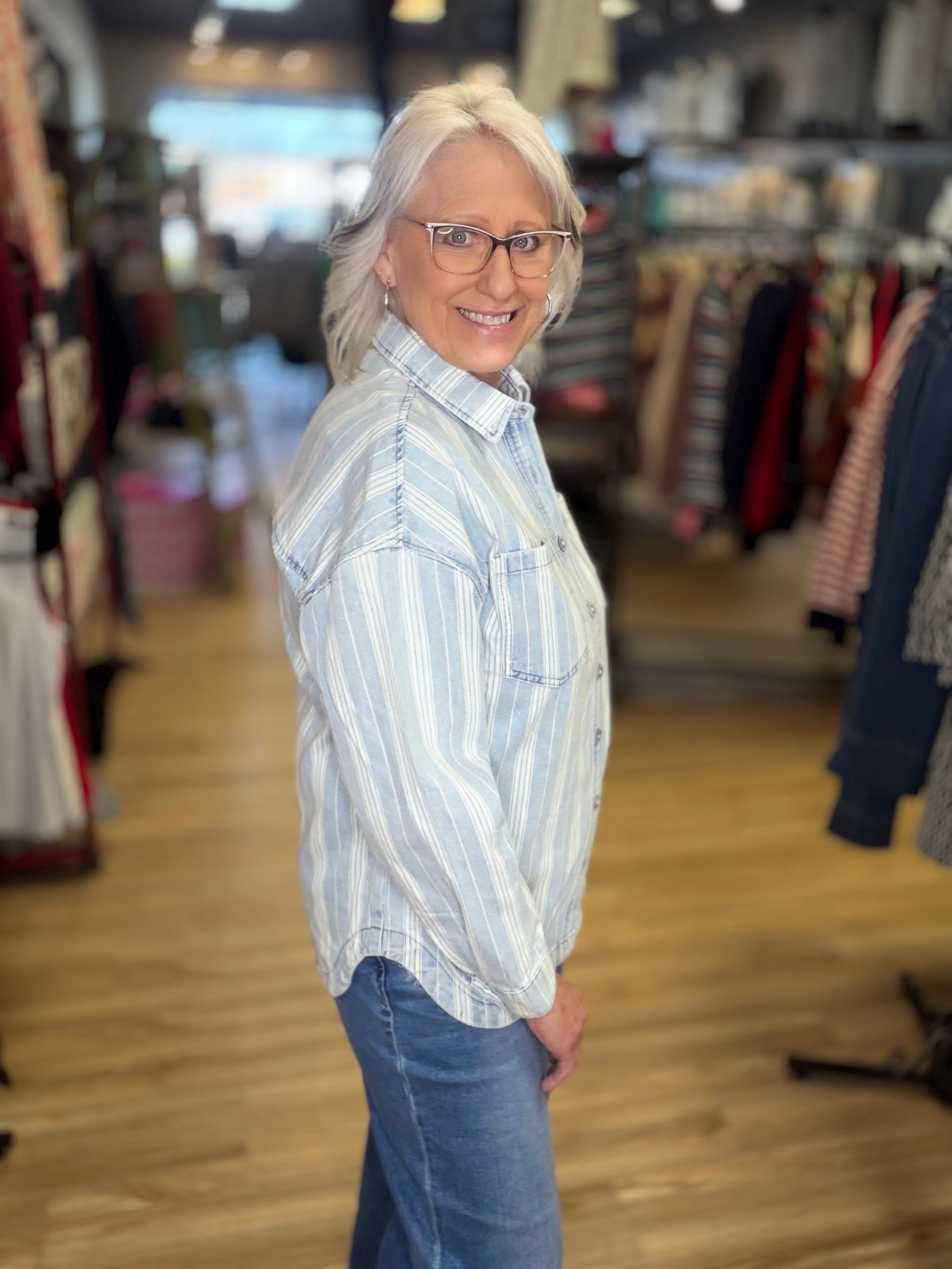 It’s a shirt. It’s a jacket. It’s a shacket!! Wear either way! Light denim with stripes and goes with everything!
