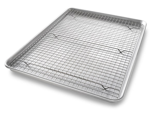 The USA PAN® Nonstick Extra Large Bakeable Cooling Rack and Sheet Pan Set of 2 is perfect for home bakers looking to make freshly baked cookies, cakes and scones that bake evenly, cool uniformly and come out tasting great. The USA PAN® Nonstick Extra Large Cooling Rack fits seamlessly inside the USA PAN® Nonstick Extra Large Sheet Pan and provides home bakers with an easy way to add the perfect glaze or finish to your homemade baked goods. Simply place your oven safe cooling rack in the pan, add your items on top of the cooling rack and you are ready to start baking like a professional. The cooling rack is easy to use and features a steel cross wire design and 6 raised feet, which elevate your baked goods into a raised position. This raised position promotes uniform cooling and air flow among your baked items. USA PAN® is a Bundy Family owned company, based in the Greater Pittsburgh, Pennsylvania area.