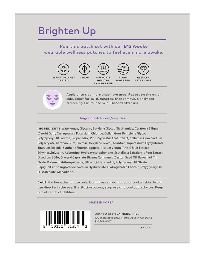 Feel refreshed with BRIGHTEN UP under eye patches from The Good Patch. Infused with Niacinamide, Vitamin K, and Pine Leaf Extract, these hydrogel eye patches are perfect for reducing the appearance of dark circles, no matter how late you stayed up last night. Feel good and look good with The Good Patch! (Pro Tip: Pair this patch set with our B12 Awake wearable wellness patches to feel even more awake.)