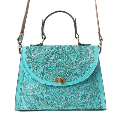 Purse, Savannah Scroll Handtooled Leather Bag in Turquoise