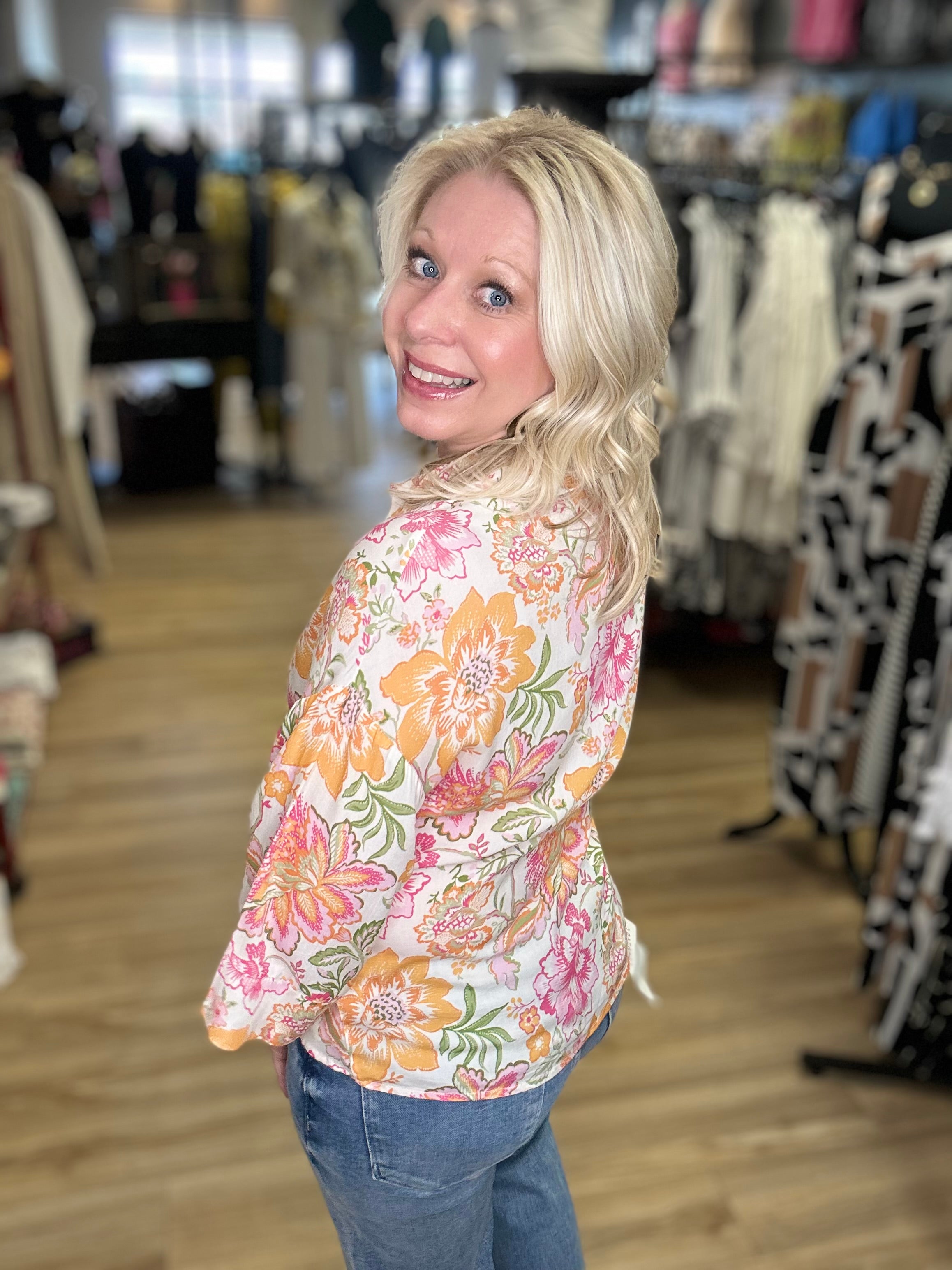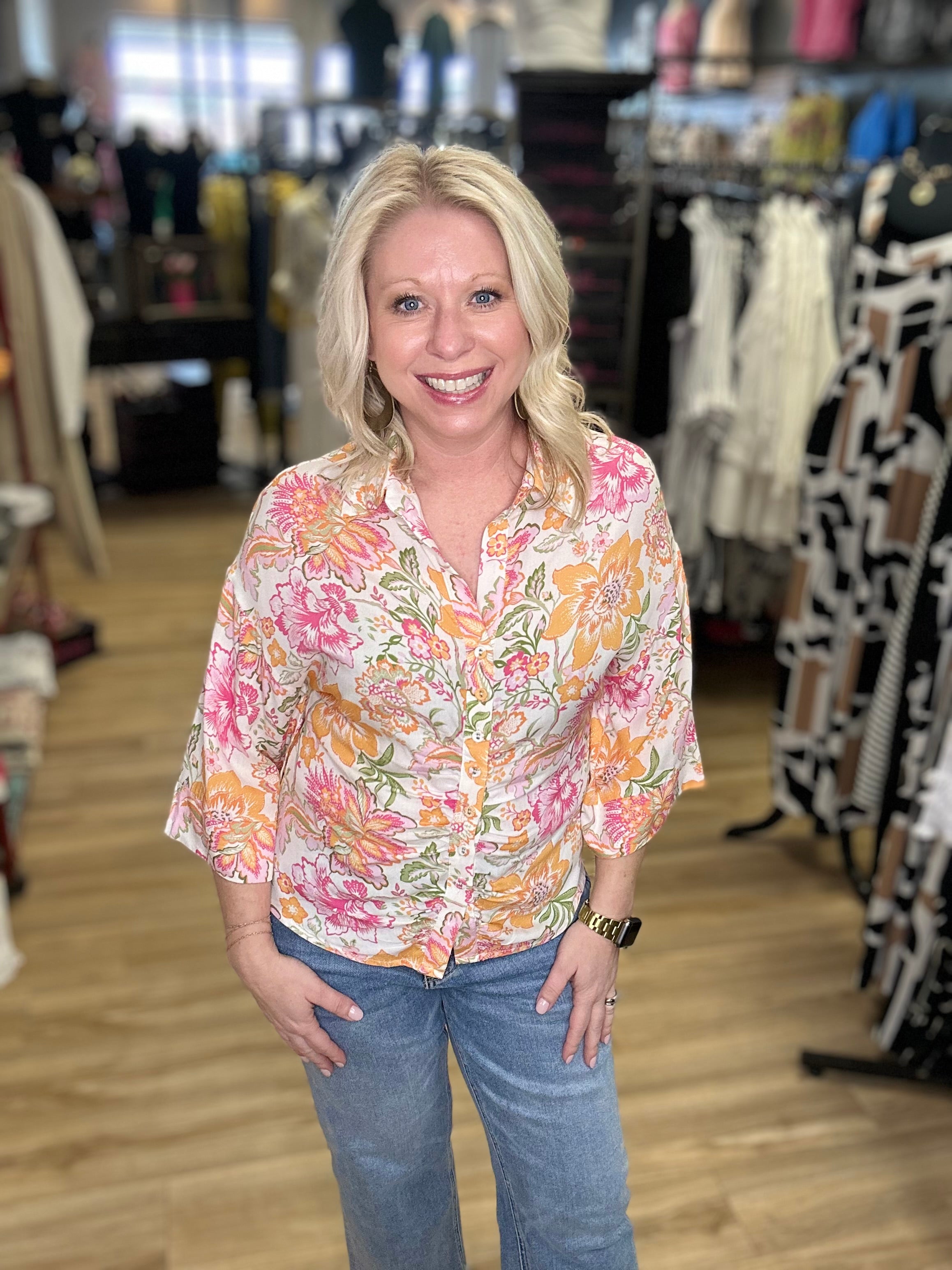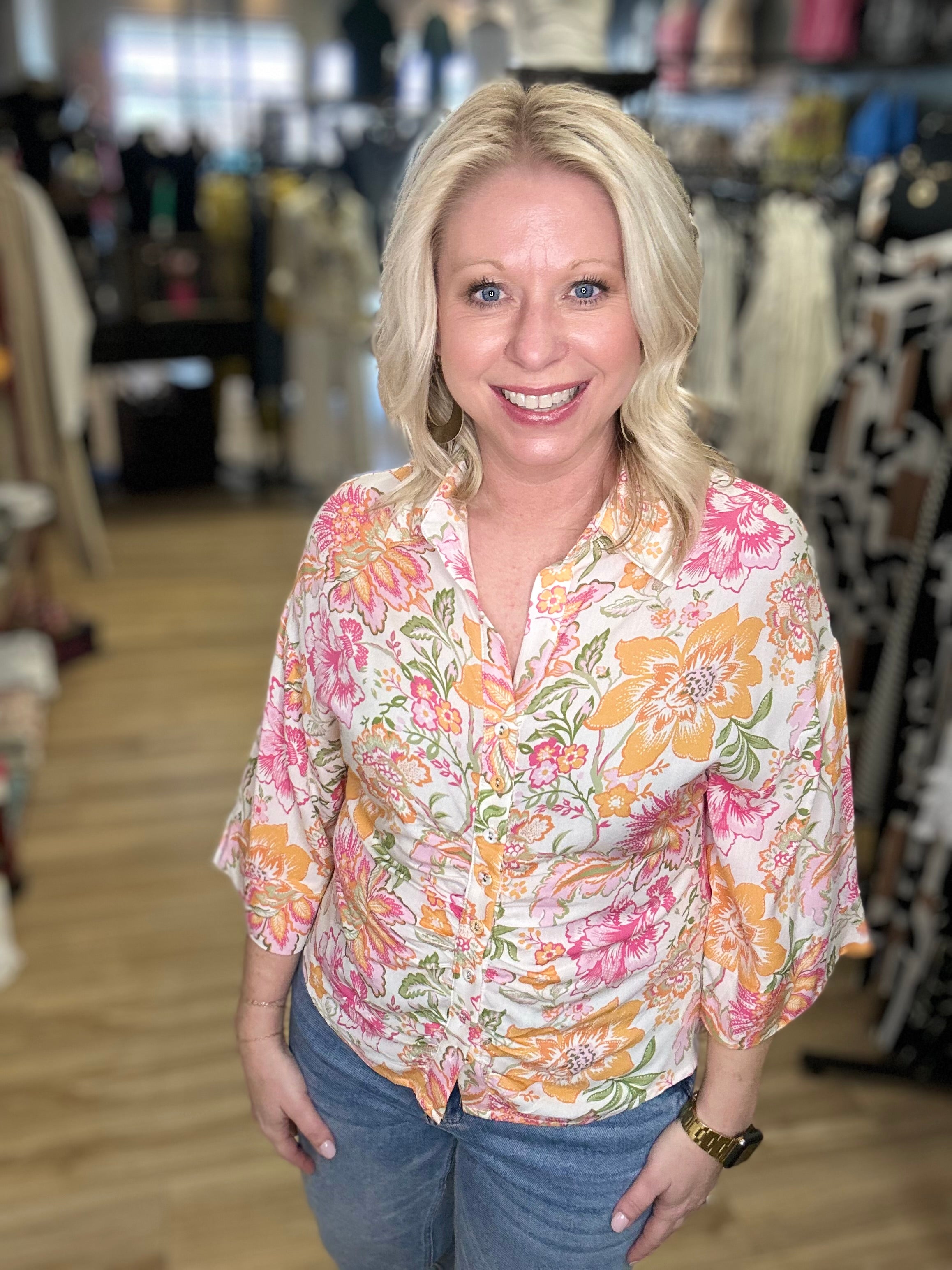Floral button up 3/4 sleeve top.  Gathered along the buttons to give extra dimension.  Runs a tad snug so may want to size up.